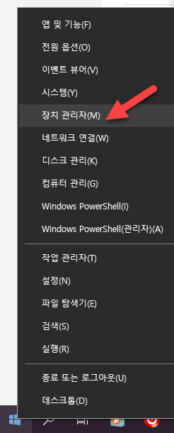 시작 단추에서 마우스 오른쪽 단추를 눌러 [장치 관리자]를 엽니다.