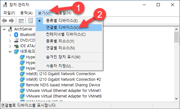 [보기] -> [연결별 디바이스]를 선택합니다.