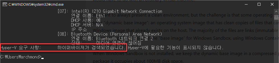 참고2: 내 PC가 가상화를 지원하는지 알아보려면, 명령 프롬프트(cmd)에서 systeminfo 를 실행해보세요.