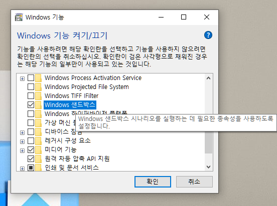 'Windows 샌드박스'에 체크하고, [확인]을 누릅니다.(재부팅 필요)