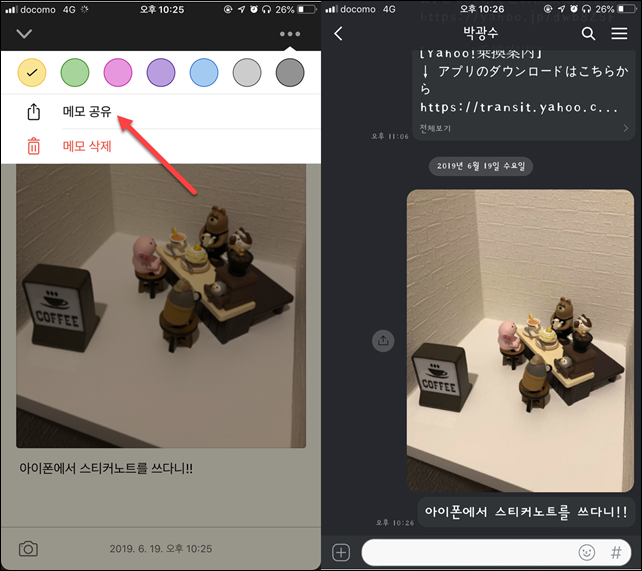 ▲PC와는 다르게, '메모 공유'기능이 제공됩니다. 메일이나 메신저로 바로 공유가능합니다.