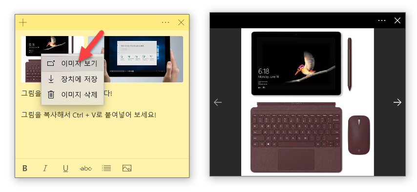 ▲이미지도 넣을 수 있습니다. 그림을 복사하거나, 이미지 추가 버튼을 클릭해서 메모에 넣어보세요.
