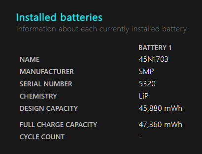 장착된 배터리(Installed batteries)에는 배터리의 설계 용량(Design Capacity)과 마지막 완전 충전 용량(Full Charge Capacity), 완전 충전 횟수(Cycle Count) 등이 표시됩니다.