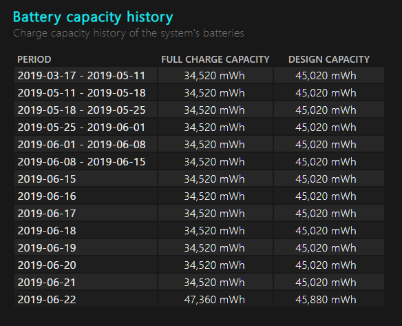 배터리 용량 내역(Battery capacity history)도 볼 수 있습니다. 6월 22일에 갑자기 용량이 늘어난 것을 확인할 수 있죠? 배터리 교체 시점과 일치하고 있습니다.