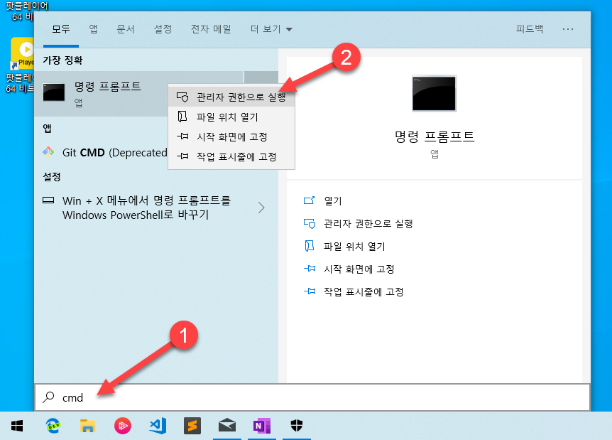 시작 메뉴에서 "cmd"를 입력해 마우스 오른쪽 단추로 클릭합니다. [관리자 권한으로 실행]해주세요.