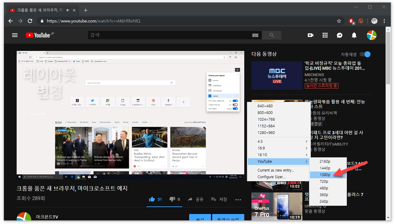 유튜브 동영상을 볼 때도, 브라우저를 해당 영상에 알맞은 크기로 늘이거나 줄이고 싶을 때가 있죠. 내 모니터에 맞게, 4:3 혹은 16:9에 맞는 윈도우 크기로 조절하거나 1080p, 2160p에 맞출 수도 있다면?