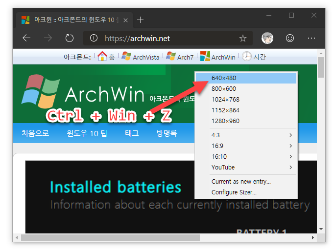 이제 원하는 프로그램에서 [Ctrl] + [Windows] + [Z] 단축키를 눌러보세요. Sizer 메뉴가 나타납니다. 원하는 크기를 선택하여 창 사이즈를 조절할 수 있습니다. 테스트 겸, 웹 브라우저를 640 x 480을 선택해 축소시켜봤습니다.