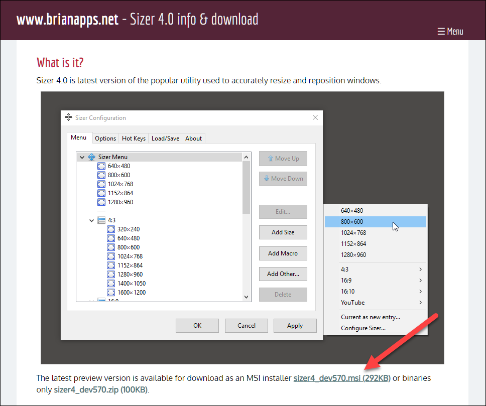 http://www.brianapps.net/sizer4/ 에 접속한 뒤, sizer4_dev570.msi (292KB)를 다운로드 후, 실행합니다.