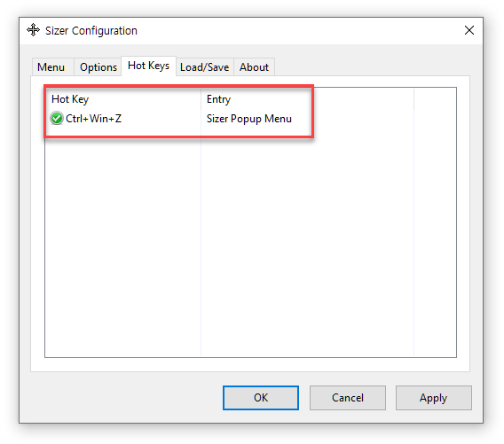 단축키(Hot Keys) 탭을 보면 [Ctrl] + [Windows] + [Z] 키보드 단축키가 설정되어 있습니다.