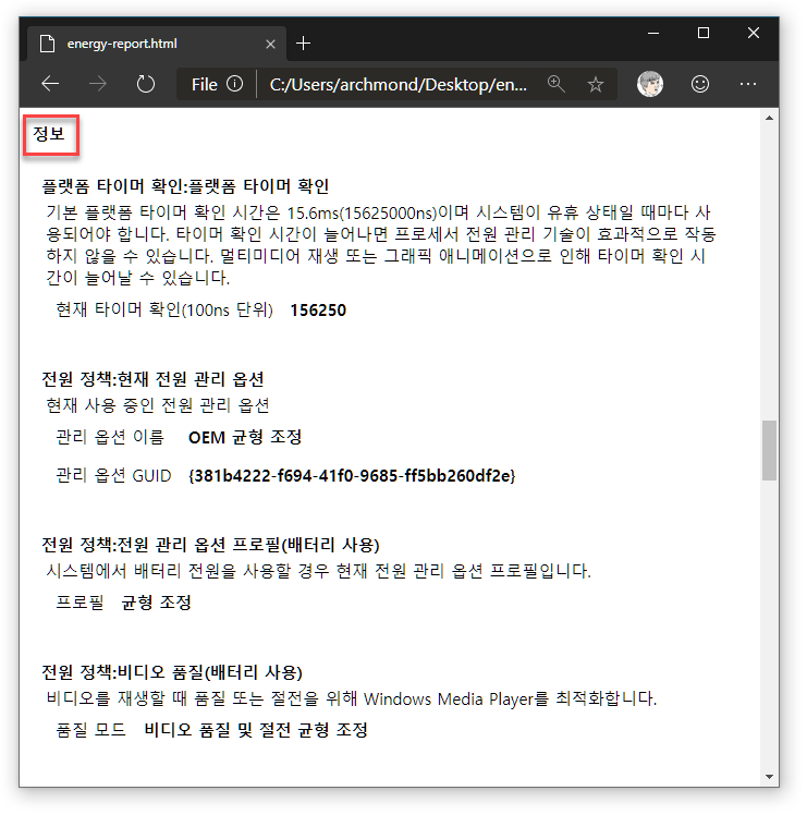 ▼완료되면 아래의 경로를 복사해서 웹 브라우저(크롬, 사파리, 파이어폭스, 에지, 인터넷 익스플로러 등)로 열어보세요. 전원 효율성 진단 보고서의 내용이 나타납니다.