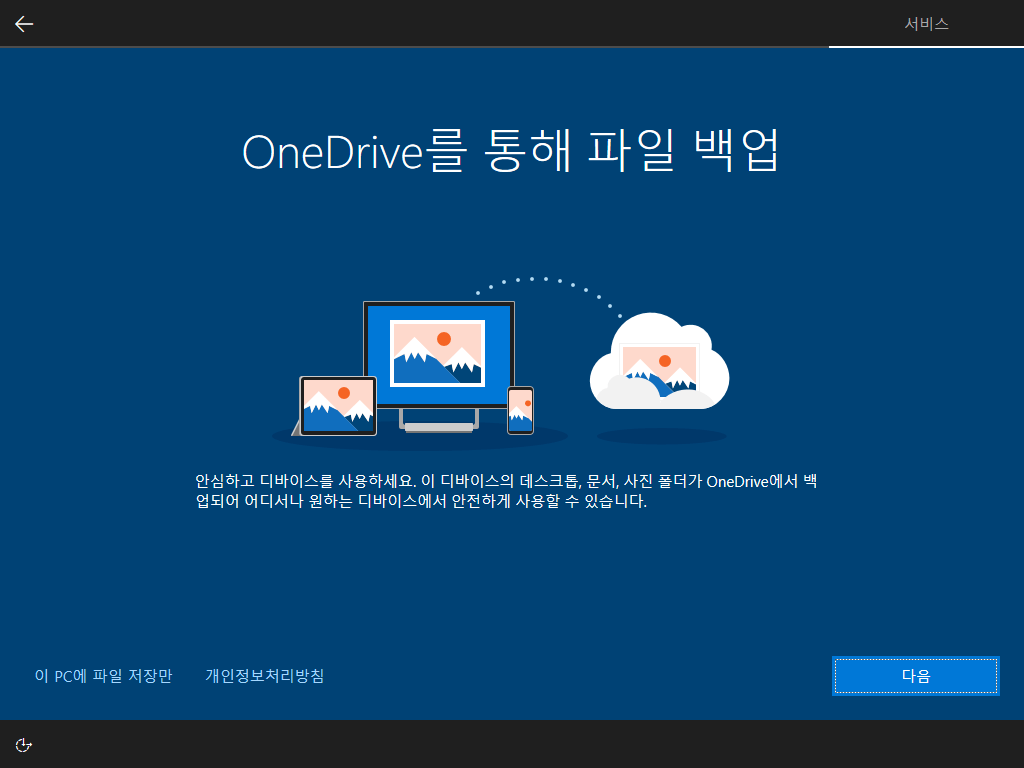 OneDrive를 통해 파일 백업. 디바이스의 데스크톱, 문서, 사진 폴더를 자동으로 동기화할 것인지 묻습니다. 저는 [이 PC에 파일 저장만]을 선택해 바탕화면, 문서, 사진 폴더의 동기화는 사양했습니다.