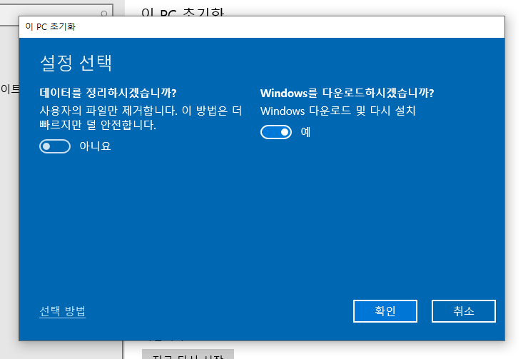 설정 변경을 눌렀을 때. Windows를 다운로드하시겠습니까?(Windows 다운로드 및 다시 설치)가 기본적으로 [예]로 설정되어 있습니다. [확인].