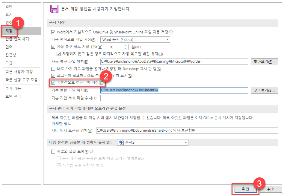 ▲저장 탭에 들어가서, [기본적으로 컴퓨터에 저장]을 클릭합니다. 그리고 확인을 눌러주세요!
