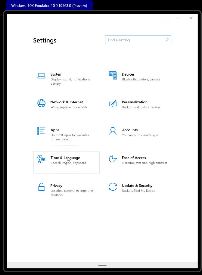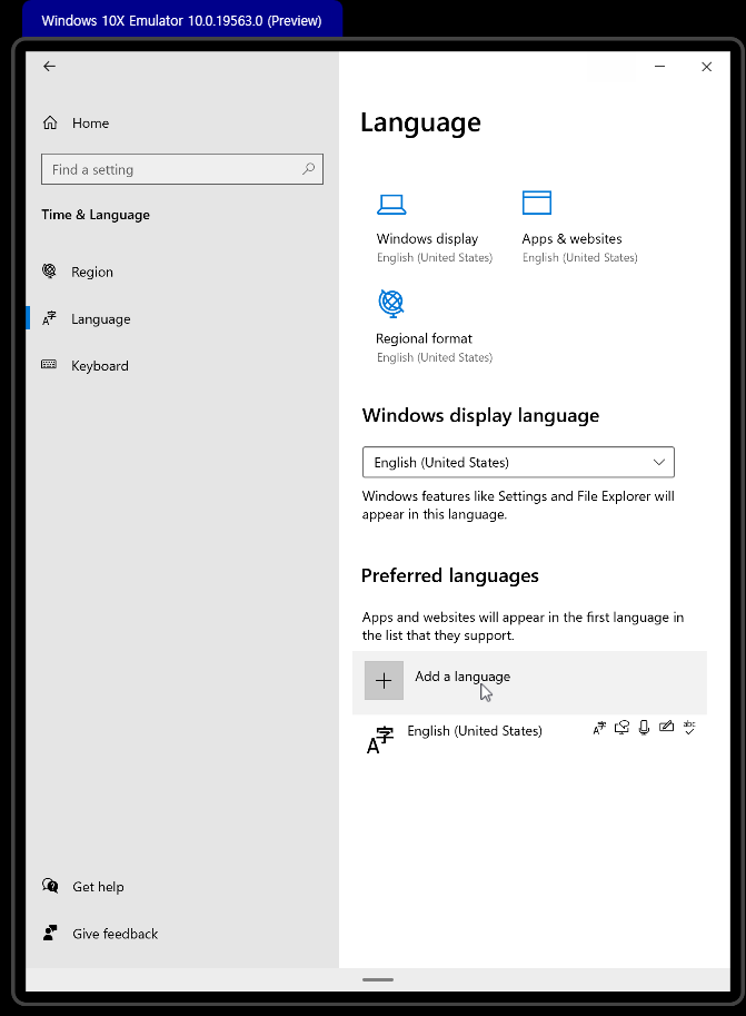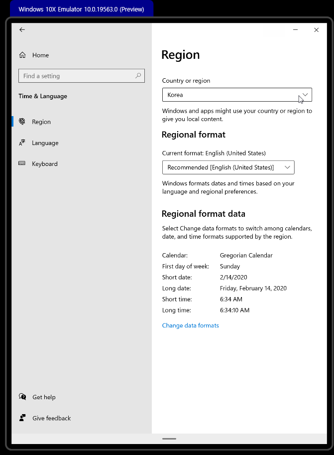 기본적으로 윈도우 10X(Windows 10X)를 시작하면 영문으로 표시됩니다. 인터넷이 연결된 환경이라면 언제든지 자신에게 익숙한 언어로 변경해 사용할 수 있습니다. 마치 윈도우 10처럼요.