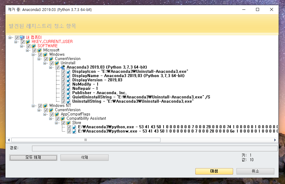 참 착하게도 Anaconda3 관련 레지스트리 찌꺼기를 잘 검색해줬습니다. 지워도 된다는 판단이 섰다면, [모두 선택]하여 [삭제]하면 되겠죠?