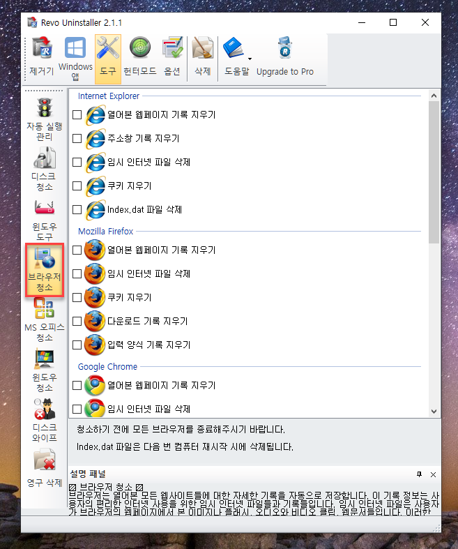[브라우저 청소]에는 컴퓨터에 설치된 여러 웹 브라우저의 임시 파일을 한 방에 삭제할 수 있습니다! 이건 대박 기능이네요.