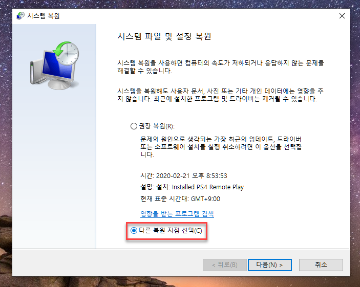 '다른 복원 지점 선택'을 클릭해 [다음]