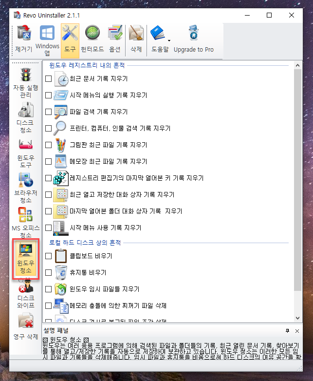 [윈도우 청소]도 꽤나 여러 작업이 가능하네요. 특히나 메모리 충돌에 의한 찌꺼기 파일 삭제나 디스크 검사로 복구된 파일 조각 삭제 등은 흥미롭습니다.