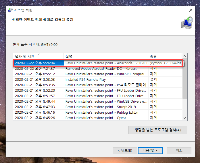 복원할 프로그램명 관련해서 선택 후, [다음]을 누르면 복원이 시작됩니다.