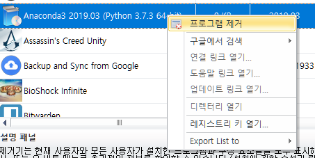 메인 화면은 이렇게 생겼습니다(무려 한글 지원!). 삭제 프로그램을 통하지 않고, 실수로 Anaconda3의 폴더를 수동으로 삭제해버려서, 위와 같이 크기 0KB인 상태로 프로그램 목록에 남아버렸는데요,