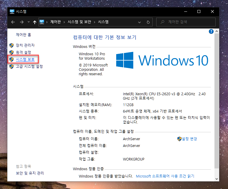 시스템 보호를 클릭.