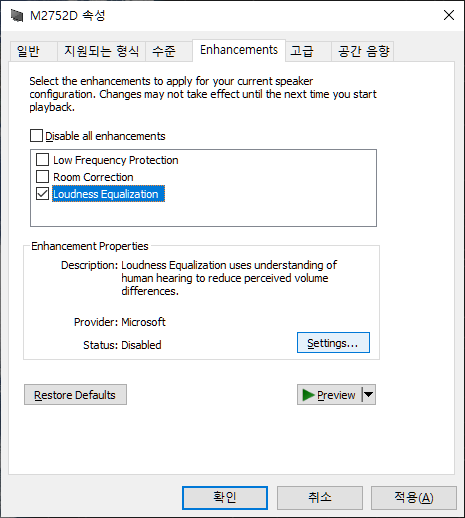 윈도우 10의 소리 옵션에는 ‘라우드니스 이퀄라이제이션(Loudness Equalization)’이라는 사운드 효과를 제공하고 있습니다. 음량을 낮게 설정했을 때, 고음과 저음 부분을 좀 더 명확하게 해 주는 기능으로, 조용한 환경에서 낮은 볼륨으로 노래 등을 들을 때 도움을 받을 수 있습니다.