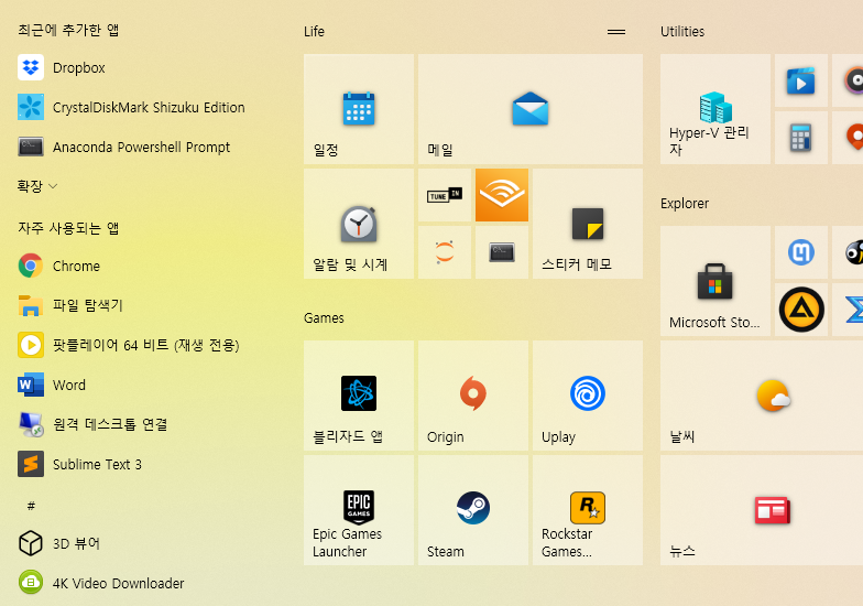 와… 이 아름다운 시작 메뉴를 보소… 이 변경점 하나만으로도 20H2로 업데이트한 보람이 있다. 아이콘도 예뻐졌다.