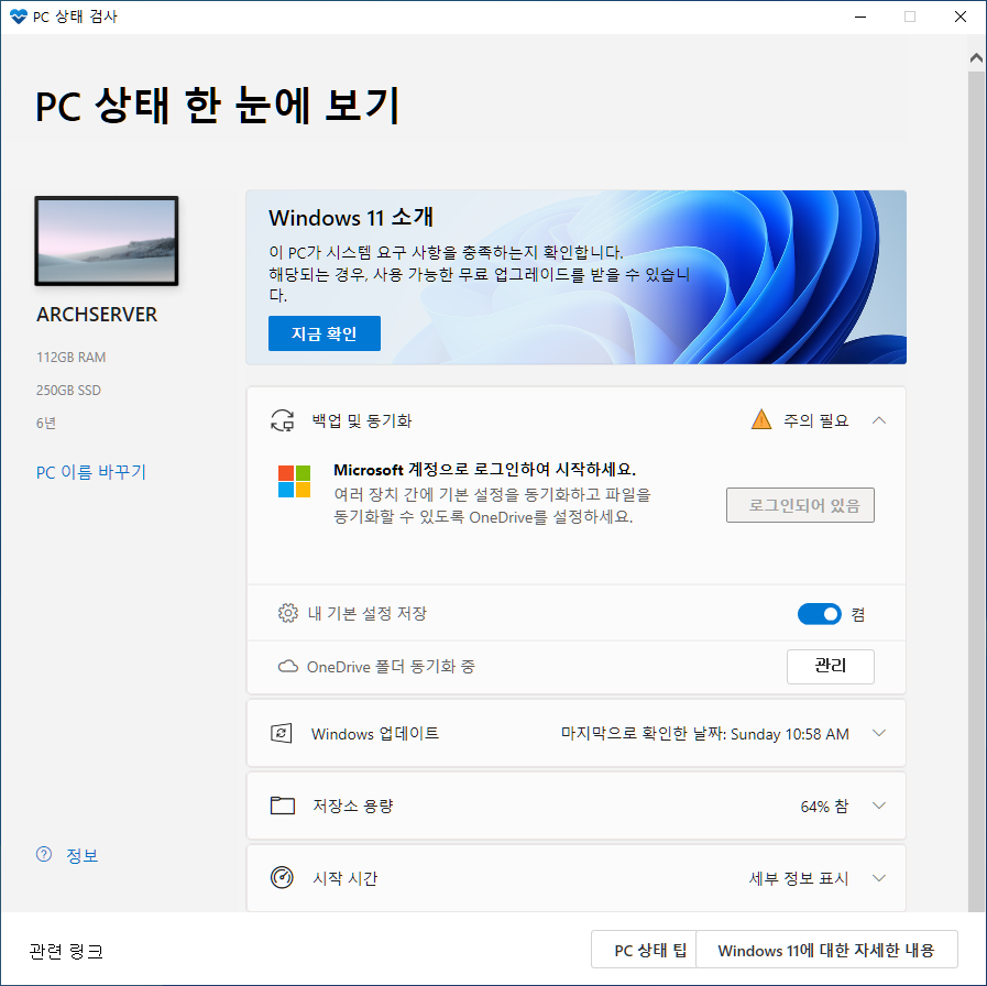 마이크로소프트에서 제공하는 PC 상태 검사 앱(다운로드 링크)을 사용하면 [지금 확인] 단추를 눌러 내 PC가 윈도우 11에 적합한지 확인할 수 있습니다.