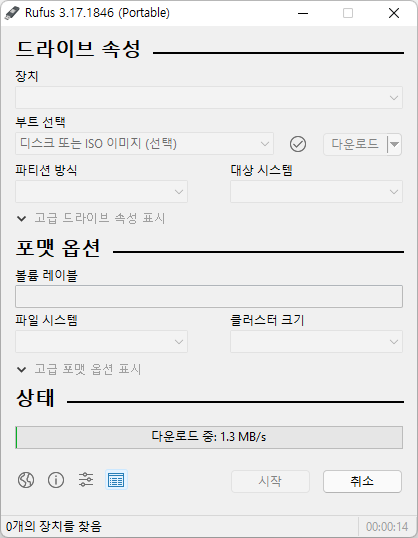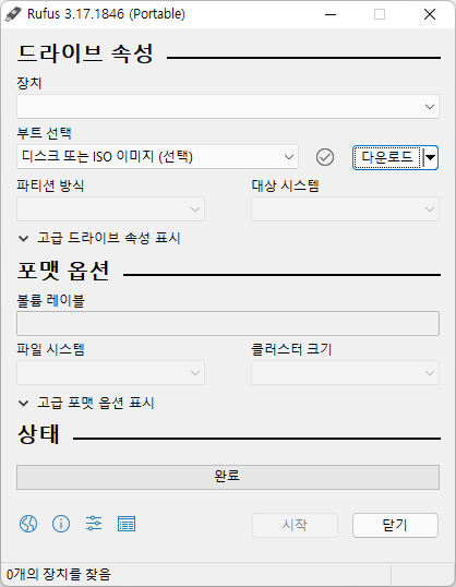 Rufus를 다운로드해 실행합니다. [다운로드] 단추를 누릅니다.