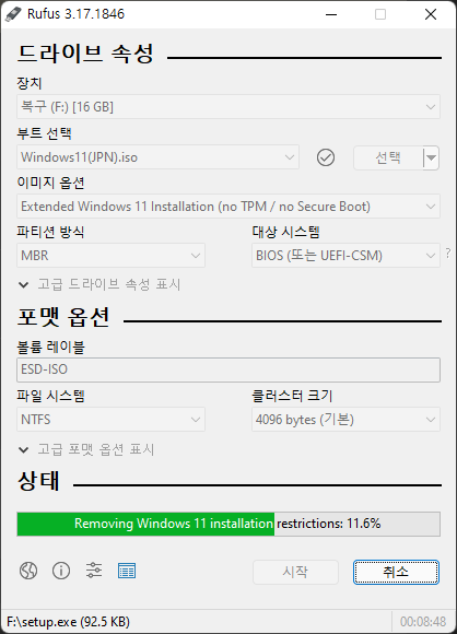 작업 도중에 윈도우 11 설치 제한을 풀어주는 것을 확인할 수 있습니다.