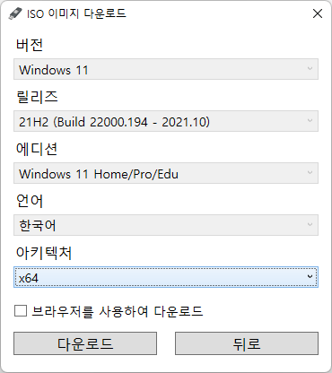 버전, 릴리즈, 에디션, 언어, 아키텍처를 선택해 윈도우 11 이미지를 다운로드합니다.
