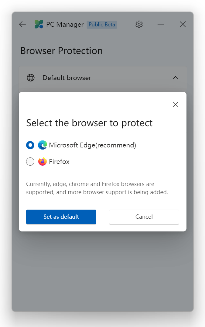 기본 브라우저 설정을 변경할 수 있습니다. 마이크로소프트 제품인 Edge를 추천하지만, Chrome/Firefox 등을 선택하더라도 문제없습니다. 추후 지원 브라우저가 늘어난다고 하네요.