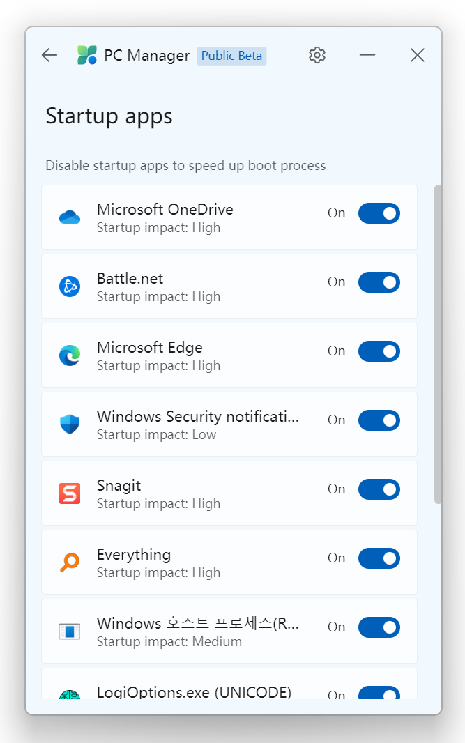 설정 앱의 시작 앱과 거의 동일한 인터페이스이지만, Microsoft PC Manager 앱 속에 통합되어 있어 사용하기 편리한 느낌을 줍니다. On/Off를 선택하여 컴퓨터가 켜질 때 자동으로 실행할 앱만 켜 놓을 수 있습니다.