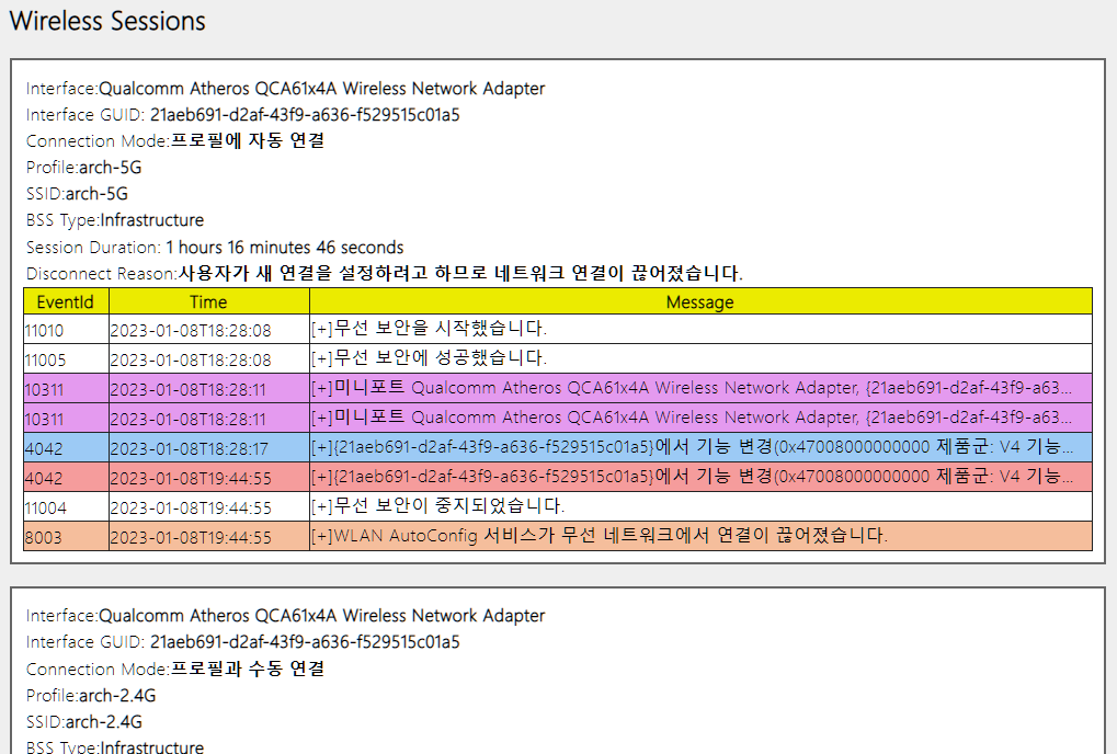 ▲요약(Summary)에서는 무선 연결 세션의 성공/실패/경고 회수와 연결이 끊어진 이유 등을 기록하고 있습니다.