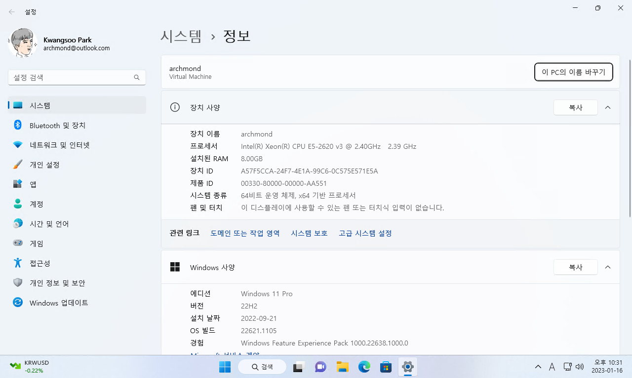 ▲장치 사양, 윈도우 사양을 간단히 확인할 수 있습니다.
