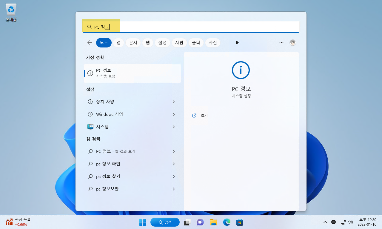 ▲ 시작 단추를 눌러 'PC 정보'를 입력해 실행합니다. ※ [윈도우 키] + [PauseBreak] 단축키로 실행 가능.