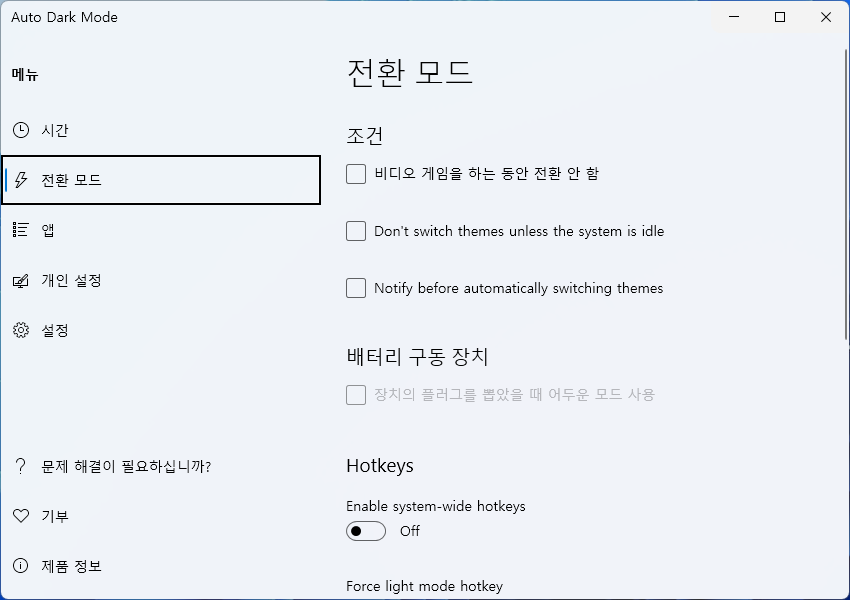 ▼전환 모드 메뉴에는 다크 모드로의 전환 조건, 배터리 사용 시 자동으로 사용하게 하는 옵션, 단축키 등이 제공됩니다.
