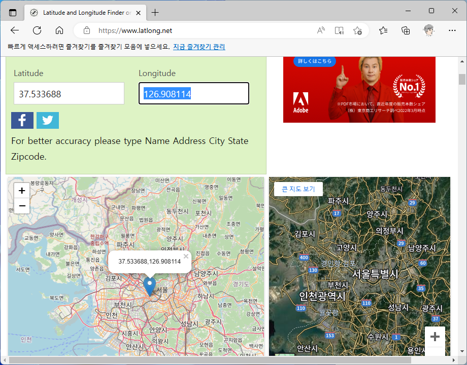 ▼latlong.net이라는 사이트에 연결됩니다. 지도를 이동해 클릭하면 해당 위치의 좌표를 알려줍니다. 경도와 위도(longitude and latitude)를 복사합니다.
