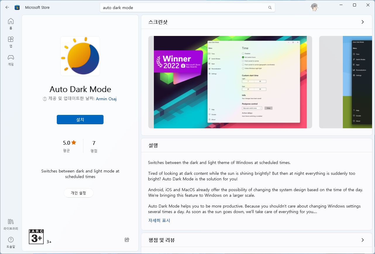 ▼아래 링크를 클릭하거나, Microsoft Store에서 'auto dark mode'로 검색해 설치합니다.