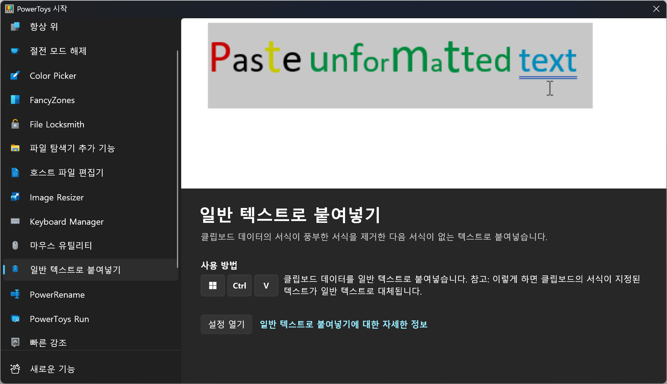 최신 버전의 PowerToys 설정에 '일반 텍스트로 붙여넣기 사용'이 자동으로 활성화되어 있으며, 원한다면 다른 단축키로 편집할 수 있습니다.