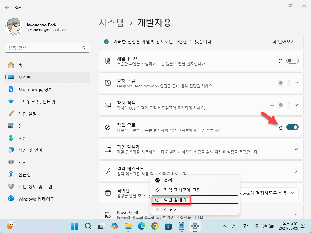 [개발자용] 작업 표시줄의 "작업 종료" 옵션에 대한 로직을 업데이트하여 작업을 종료하기 전에 확인을 위한 응답하지 않음 대화 상자가 더 이상 표시되지 않도록 했습니다.
