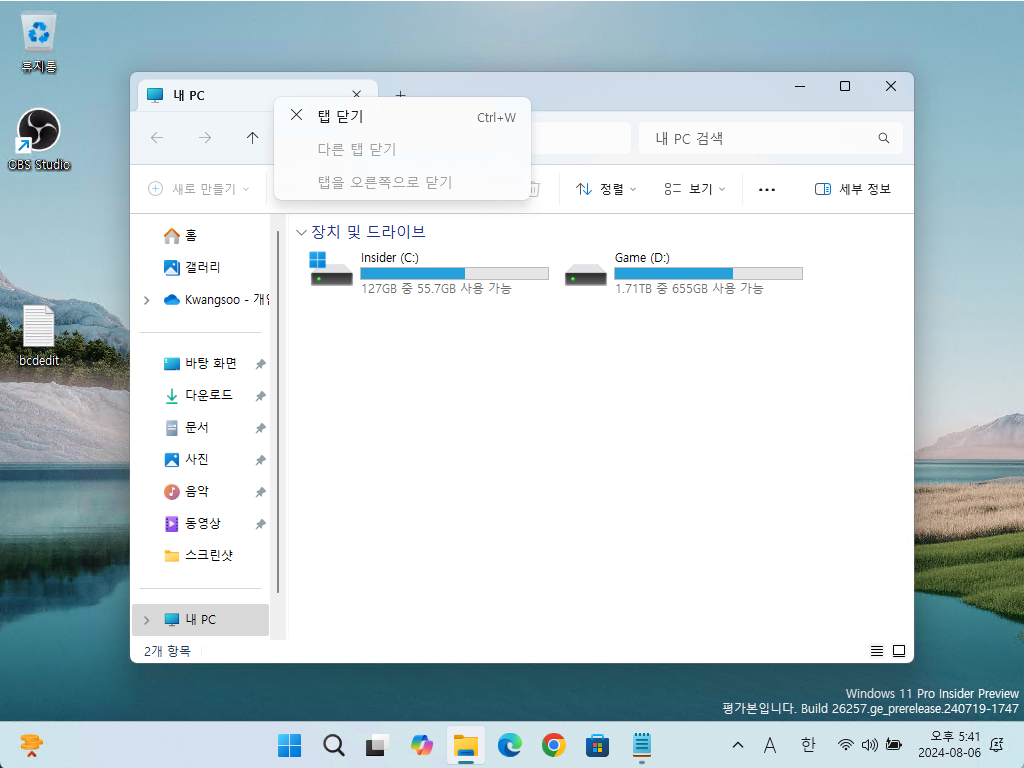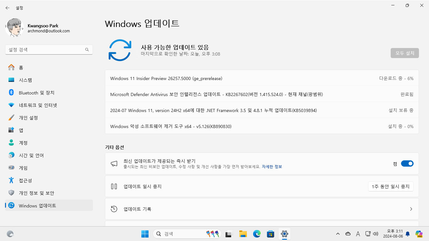 Windows 11 Insider Preview 26257.5000 (ge_prerelease.240719-1747)를 설치했습니다.