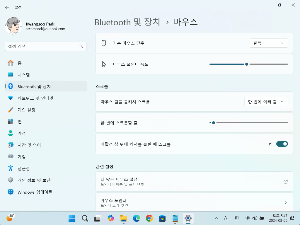 [입력] 설정 > 블루투스 및 장치 > 마우스에서 마우스 포인터 정밀도 향상 기능을 사용하지 않으려는 사용자를 위해 이 기능을 끌 수 있는 옵션을 추가하고 마우스 스크롤 방향을 변경할 수 있는 새로운 옵션을 추가했습니다.