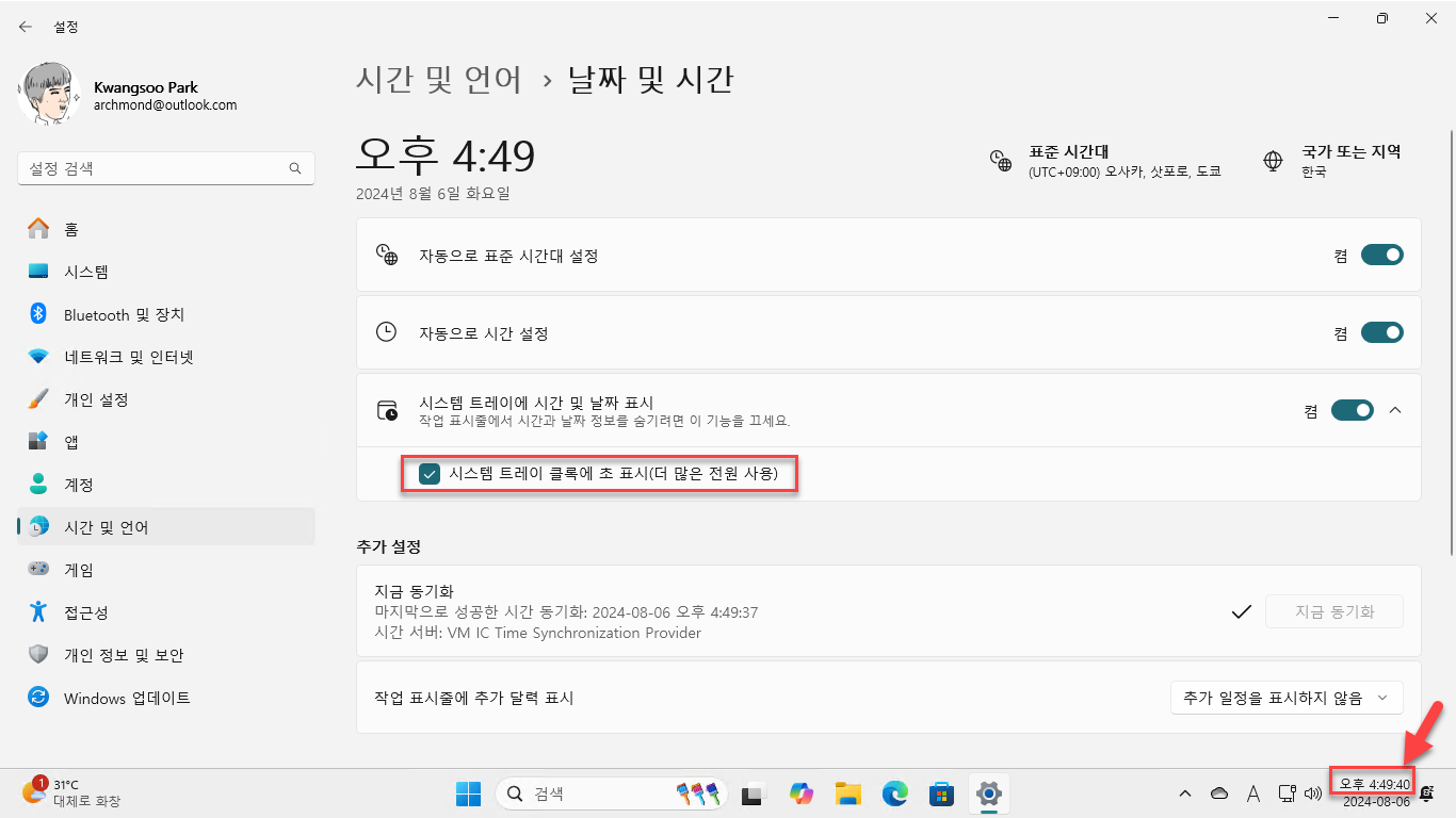 [작업 표시줄 및 시스템 트레이] 시스템 트레이 시계에 초를 표시하는 설정이 '시스템 트레이에 시간 및 날짜 표시' 아래의 설정 > 시간 및 언어 > 시간 및 날짜로 이동했습니다.