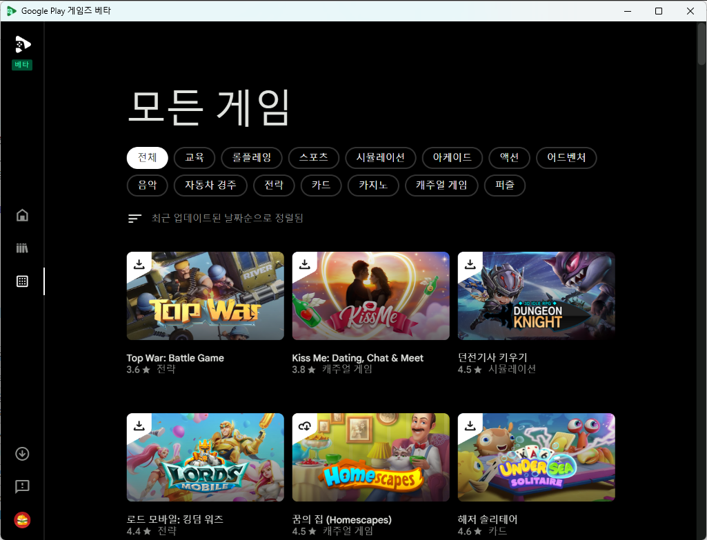 설치를 완료하면 위와 같은 메인 화면이 나옵니다. 좌측 메인 메뉴에서 ‘모든 게임’을 선택하면 꽤 많은 게임이 제공되는 것을 볼 수 있습니다. 하지만 아직 검색 기능은 제공되지 않는 것 같네요.