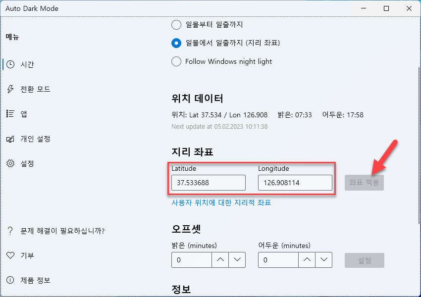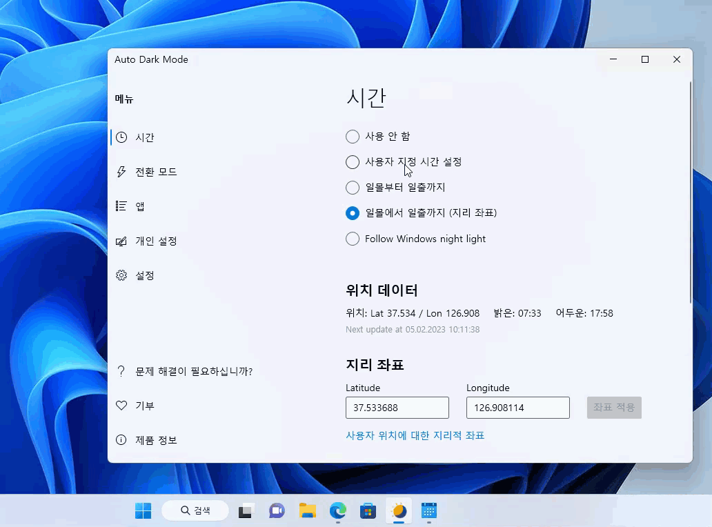 윈도우 11 오토 다크 모드: 일몰🌇과 일출🌅에 맞추어 테마를 변경해주는 편리 도구