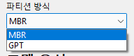 그리고 파티션 방식을 MBR로 바꿔줍니다(UEFI가 지원되는 컴퓨터라면 GPT를 사용하세요).