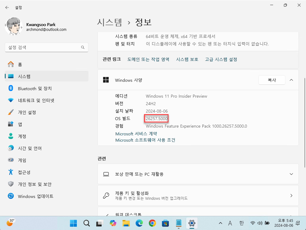 Windows 11 Insider Preview 26257.5000 (ge_prerelease.240719-1747)를 설치했습니다.