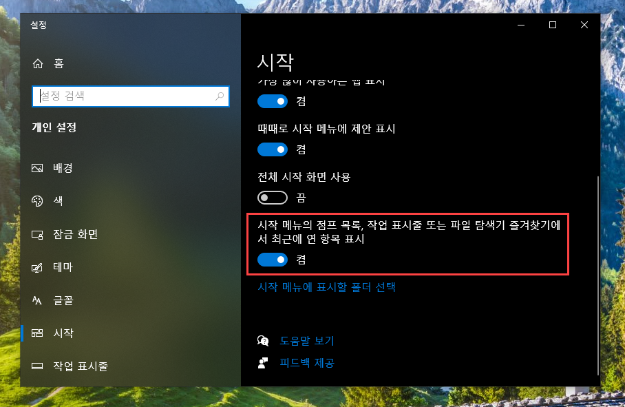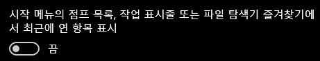 '시작 메뉴의 점프 목록, 작업 표시줄 또는 파일 탐색기 즐겨찾기에서 최근에 연 항목 표시'이 [켬]으로 되어 있는데요,