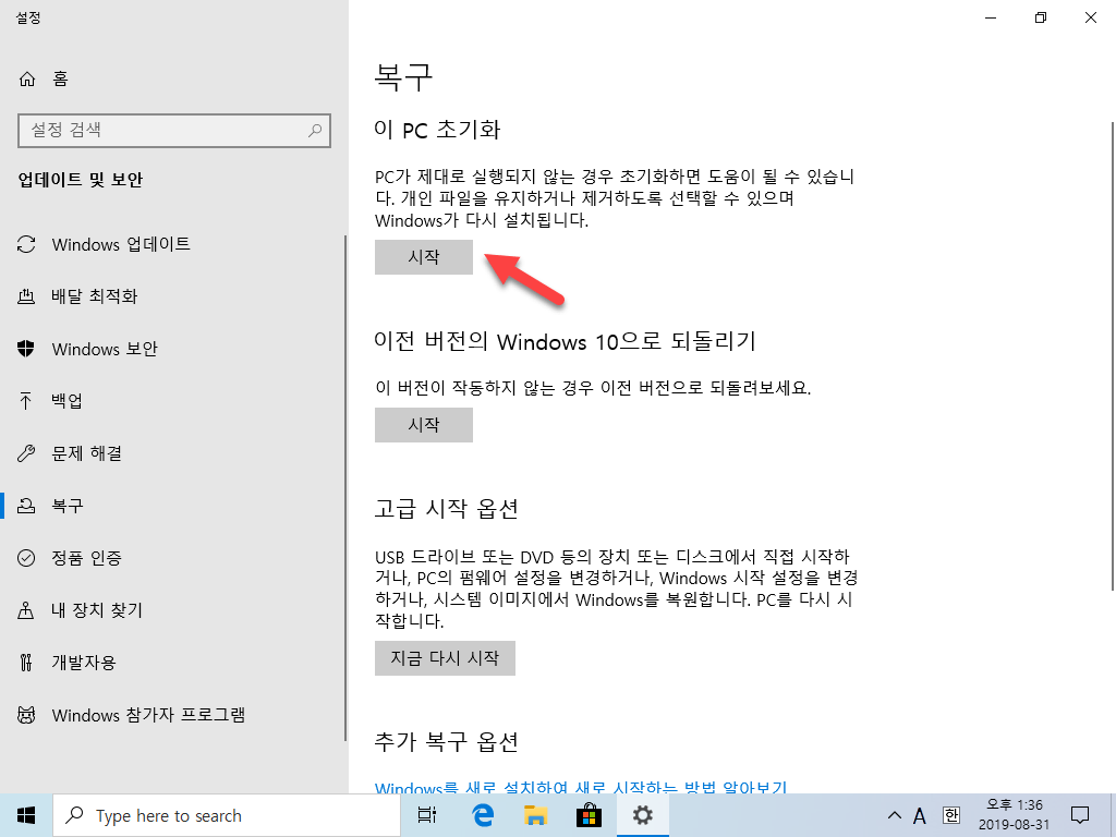 복구 탭에서 ‘이 PC 초기화’에 들어갑니다. [시작]을 눌러 어떤 옵션이 추가되었는지 확인해보죠.